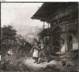 Fundmeldung Bauernpaar vor der Schenke Hersteller/Künstler:in Quaglio, Lorenzo (Umkreis) Objektart Gemälde Material / TechnikÖl ; Holz (Eiche) / gemaltLost Art-ID519137