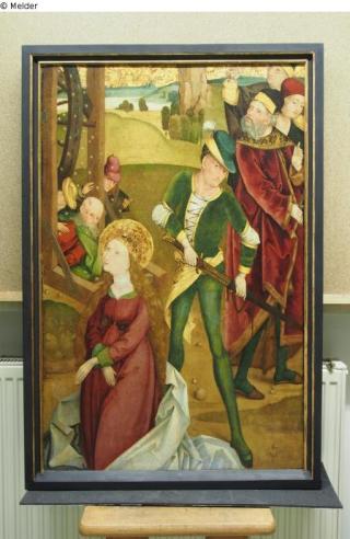 Fundmeldung Katharinenlegende: Enthauptung der hl. Katharina Tafelbild; Altarflügel Hersteller/Künstler:in Meister des Kaufbeurer Sakristeischrankes, Kaufbeuren Objektart Gemälde Material / TechnikÖl ; Holz / gemaltLost Art-ID598738