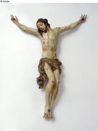 Fundmeldung Corpus Christi / Corpus des gekreuzigten Christus / Gekreuzigter / Christus am Kreuz Hersteller/Künstler:in Unbekannt (Süddeutsch (Österreich oder Bayern)) Objektart Vollplastik Material / TechnikHolz (Linde) / gefasst farbigLost Art-ID578128