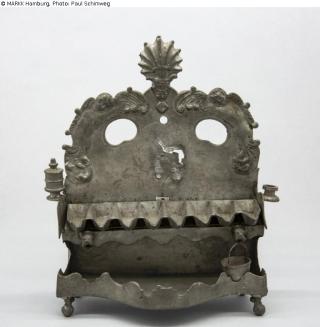 Fundmeldung Chanukka-Leuchter Hersteller/Künstler:in Johann Georg Auer, Rothenburg ob der Tauber, 1758 vermutlich spätere Serienfertigung Objektart Ritualgegenstände und Zubehör Material / TechnikMetall (Blei) / gegossenLost Art-ID626356