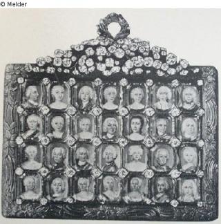 Suchmeldung Tableau mit 28 Miniaturenbildnissen von Angehörigen und Verwandten Herzog Karls I. von Braunschweig (?) Objektart Malerei Material / TechnikMetall (Silber) / aquarelliertLost Art-ID404369
