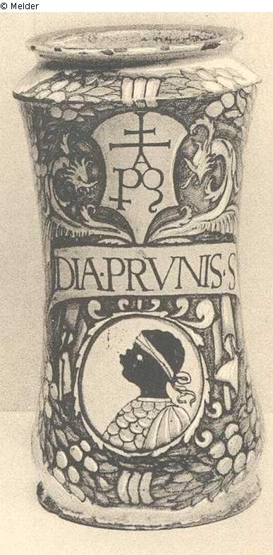A BRIGHTLY COLOURED ALBARELLO, decorated on the upper part with an orange shield bearing the monastic mark "P.A.Q." below a double cross with two winged monsters at either side, in the lower part a blackamoor's head in profile to dexter, divided by an orange label with the name of the drug in blue, DIA ? PRUNIS • s, the whole enclosed by a blue wreath with clusters of fruit, the reverse with blue ribbon scrolls, Deruta, circa 1501
