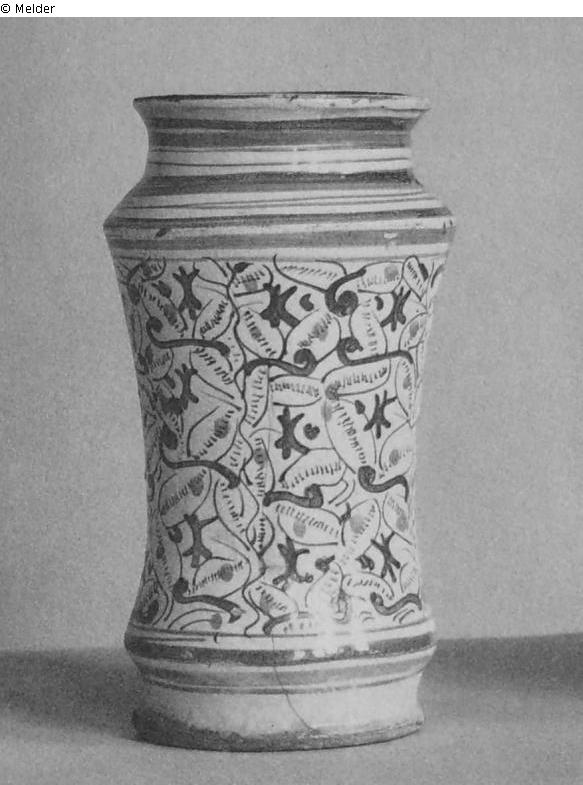 Bemalt in Blau und Ockergelb. Auf dem Körper kleingliedriges Muster in Nachahmung spanisch-maurischer Majoliken: gestichelte Ovalblätter, dazwischen kräftige Blütengebilde in Form heraldischer Lilien und liegende Rollschnörkel. Unregelmäßig verstreute gelbe Tupfen. Auf Hals, Schulter und Ablauf blaue und gelbe Parallelstreifen. Sprung. Gegenstück zu Lot 23 (Weinmüller: Gegenstück zur vorigen Nummer. Mit Sprung. Abgebildet bei