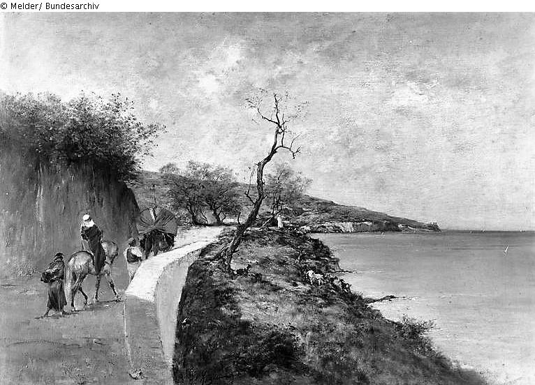 Im Vordergrund links ein Araber zu Pferd, begleitet von zwei Personen, vor ihm ein Kamel mit Sänfte. Am Küstenhang zum Meer Hirte mit Ziegen; signiert untere Mitte "Huguet"