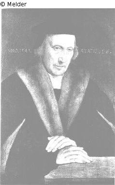 vor einem grünen, halbrund geschlossenen Grund leicht nach rechts stehend, der Blick nach unten gerichtet, die Hände auf eine Tischplatte gelegt. Er trägt eine dunkle Schaube mit hellbrauner Pelzverbrämung, ein am Hals gefälteltes und gesticktes weißes Hemd und auf dem grauen kurzen Haar ein schwarzes Barett. Beschriftet: ANNO 1541 AETATIS