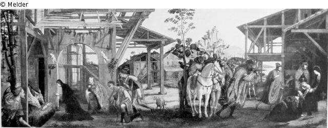 Simultandarstellung, vor weiter Felsen- und Meerlandschaft rechts und links die ruinenhaften Ställe, darin jeweils Maria mit dem Kinde. Rechts nähern sich die Könige mit ihrem pferdeführenden Gefolge, links knien in demütiger Haltung die Hirten. Helle bunte Farben. ; Literatur: Abbildung Versteigerungskatalog Tafel 8; Publiziert in Burlington Magazine 1929 von Prof. Dr. Dußler, Seite 199ff.