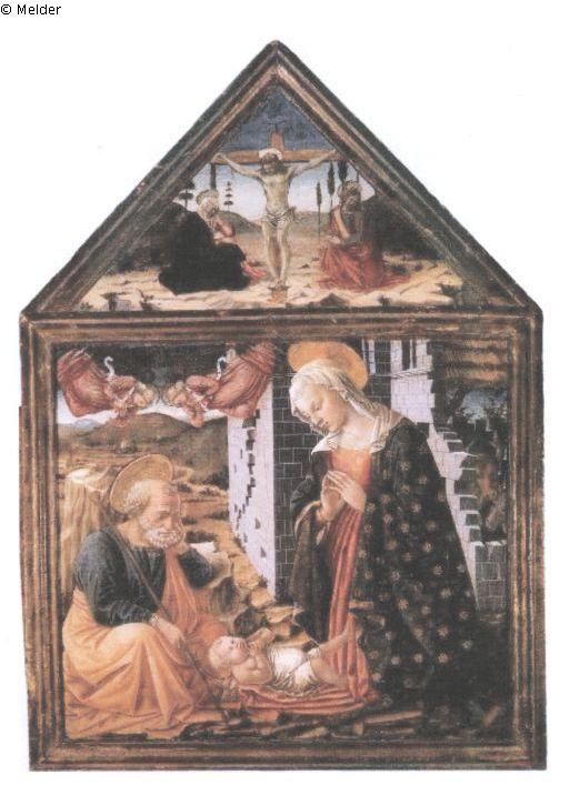 Früher Alessio Baldovinetti zugeordnet; zweiteiliges Gemäde, unterer Teil: Maria und Josef, das Kind anbetend, oberer Teil: Jesus am Kreuz; auf Rückseite: Graf v. Ingenheim, Lfd Nr. 13, S. Akten; Graf von Ingenheim´sche Bildersammlung, Erbinventar - Gemäldeverzeichnis: Nr. 25, Reisewitz, 1883.