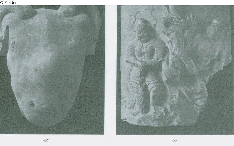 Winkelförmig gebrochen, mit Drachen auf der Kante, flankiert von zwei Vajrapâni in hohem Relief. T`ang oder später.