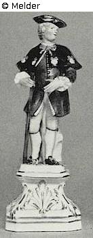 Blauer Rock, schwarzer Schulterkragen, violette Schleifen und Knöpfe, der achteckige Sockel mit Blumen belegt. Modell von Kaendler. Quelle: Rudolph Lepke's Kunst-Auctions-Haus: Antiquitäten, Gemälde: Bestände der Kunsthandlung B., Berlin, Alt-Meissener Porzellan der Sammlung Demiani u. and. Beiträge ; Möbel des 16. bis 18. Jahrhunderts, europäisches und chinesisches Porzellan, Fayencen, Steinzeug, Teppiche, Tapisserien, Bronzen, Silber, Kleinkunst, Inkunabeln u.a. (Katalog Nr. 2106). Versteigerung vom 7.10.1936. Berlin 1936; LAB, A Rep. 243-04 Nr. 3, Versteigerung vom 7./8.10.1936, Versteigerungsantrag Ball.