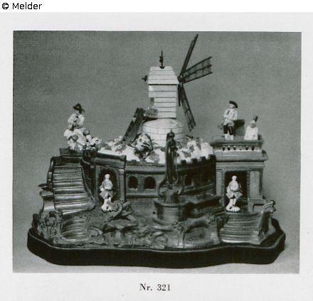 Tafelschmuck teilvergoldet, in Form einer Rotunde mit Pavillon, Treppen und Ziehbrunnen. Darauf montiert Windmühle aus frühem Meißener Porzellan auf Sockel, mit Blumen und Blättern belegt. Ferner 2 Meißener Figürchen: Rokoko-Kavaliere; sitzender Dudelsackpfeifer, daneben Müller mit einem Affen. Im Inneren Uhrwerk, das bestimmt ist, die Mühle in Gang zu setzen. Bezeichnet: De Saint-Jean. (Quelle: Externer Link)