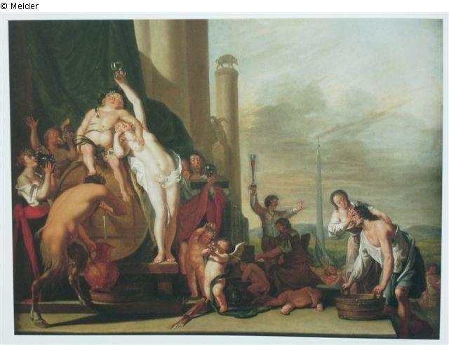 auf einer Terrasse. Auf dem Weinfass vor grünem Vorhang, sitzt Bacchus, eine nackte Frau liebkosend. Ein Satyr zapft Wein; rechts Putten und zwei Männer bei Wein und Gesang. Blick auf weite Landschaft; Abb.: Répertoire des biens Spoliés en France, Nr. 284