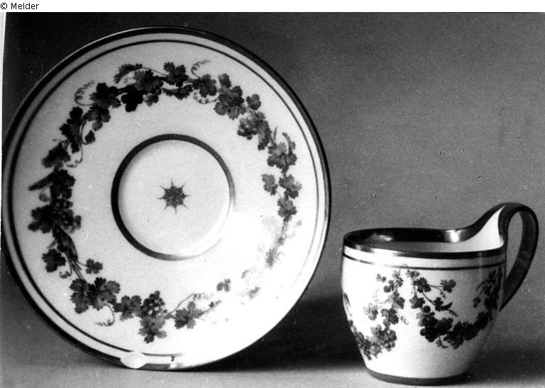 Dekor: Weinlaub und Reben mit Randvergoldung. Am Untertassenrand kleiner muschelartiger Ausschlag. Tasse: Szeptermarke, Untertasse Szeptermarke, Stempel 12.
