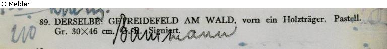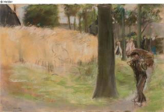 Sammlung Eduard Fuchs bis 1933; 25.10.1933 Beschlagnahmung durch die Gestapo; zwangsweiser Verkauf (Zahlung Reichsfluchtsteuer) 1937 durch seine Tochter Gertraud Fuchs: Versteigerung Rudolph Lepke, Katalog 2114, 16. und 17.06.1937, Nr. 89 („Getreidefeld am Wald, vorn ein Holzträger. Goldrahmen“); Erwerb durch Kunsthändler Hans Bammann, Düsseldorf (laut annotiertem Katalog der RKD Den Haag - Niederländisches Institut für Kunstgeschichte) für 250,- RM (Schätzpreis 210,- RM); Privatsammlung Süddeutschland; 01.06.2001 Kunsthaus Lempertz, Köln (für DM 100.000,- versteigert); im Mai 2019 soll das Pastell bei der Villa Grisebach Berlin versteigert werden - derzeit finden Restitutionsverhandlungen statt