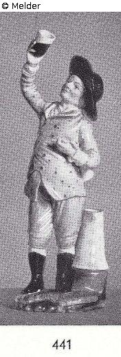 farbig dekoriert: Bauer in breitem, schwarzem Hut, grauer geblümter Jacke, lila Hosen, in der erhobenen rechten Hand ein Weinglas haltend