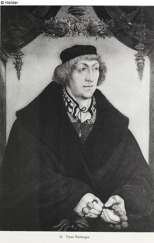 Halbfigur, frontal gesehen, der Kopf leicht nach links gewandt, mit vollem rötlichblondem Haupthaar und kleiner schwarzer Kappe. Über einem, am Kragen bestickten Hemd und schwerer Halskette trägt er ein rotes Samtwams, darüber eine dunkelolivgrüne Schaube mit breitem schwarzem Pelzkragen. Die beiden Hände halten einen Rosenkranz mit goldenen, großen Kugeln. Rahmenartige Fensternische mit goldenem Guirlandengehänge und der Jahreszahl 1515 in den Zwickeln. Am linken Daumen Wappensiegelring mit den Initialen H. P. Hellblauer Hintergrund. Br. Rahmen. Rückseitig alte, aufgeklebte handschriftliche Notiz des 17. Jahrhundert über den Dargestellten and Wappensiegel des Freiherrn von Aretin. Das Bildnis gehört with vier bekannten anderen Bildnissen des Bayr. Nationalmuseums zu einer Serie von sechs solchen, die der Meister im Jahre 1515 für Philipp von Freising ausführte. Urkunden von 1517 im Archiv zu Landshut. Quelle: Hugo Helbing Kunsthandlung und Kunstversteigerungshaus: Kunstbesitz eines Berliner Sammlers. Katalog Nr. 49. (DOI: Externer Link)