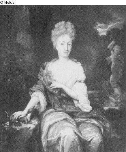 In a park landscape with fountain and decorative vase is a three quarter length portrait of a lady wearing a decollete dress with a scarf. Signed and dated 1709 in the lower left corner.