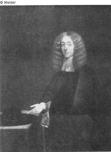 Portrait of a man in a dark suit and in a splendid wig, holding a glove in his left hand. Before him on the table is a wide-brimmed hat. Three quarter length.