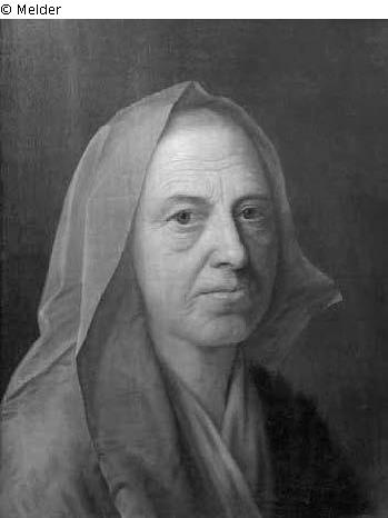 Gegenstück zu Männerporträt, Inv.Nr. SG 679. Brustbild einer alten Frau im Pelzkragen und mit einem seidenen, rötlichviolett schillernden Tuch um den Kopf; nach rechts gewandt den Beschauer anblickend, auf grauem Grund. Die Kunsthalle Hamburg besitzt ein gleiches Frauenporträt wie das ehemals Gothaer.