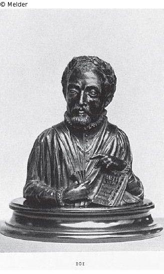 Der mit dem Lorbeerkranz geschmückte Dichter trägt einen vorn geknöpften Rock mit Halskrause und langen, eng zulaufenden Ärmeln mit schmalen Krausen an den Handgelenken. Über dem Rock ein ärmelloser Talar mit Kragen. Um den Hals hängt ein Band, dessen Enden vorn in den Rock, geschoben sind. Mit der Rechten hält er die Handschuhe; die Linke ruht auf einem schräggestellten Buch mit der Altersangabe "AN. AET. XXXIII", der Jahreszahl ,,1571", der Signatur A. A. D. und einer aus griechischen und lateinischen Buchstaben gebildeten Inschrift, die keinen Sinn ergibt. Der Meister A. A. D. ist sonst nicht bekannt. Daß es sich um ein Bildnis Tassos handelt, erweist der Vergleich mit den zahlreichen bekannten Porträtstichen. Der Dichter weilte im Jahre 1570 in Begleitung des Kardinals Lodovico d'Este in Paris, wo er von Karl IX. mit großen Ehren gefeiert wurde. Die Büste ist im folgenden Jahre entstanden. Bei der Angabe des Alters hat sich der Künstler geirrt. Patina.