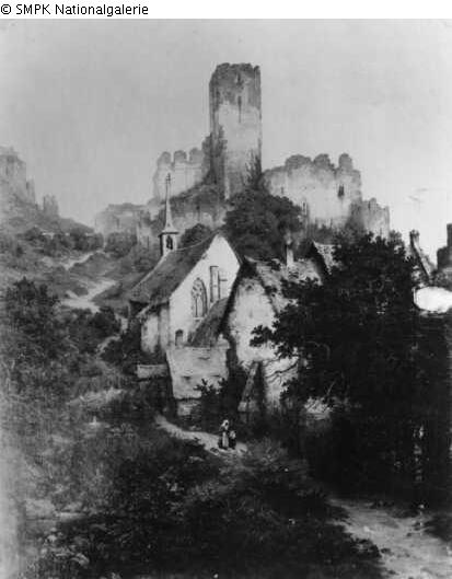 Tafelmalerei: Bild: Landschaft mit Ruinen & Burg, Schloß & Ruine eines Gebäudes & kleine Kirche, Kapelle & Dorfstraße & Felsen
