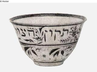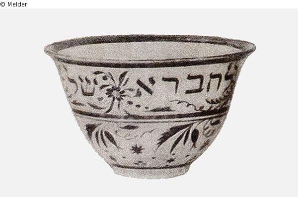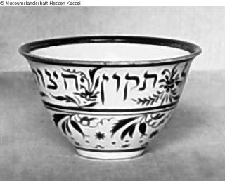 Ohne Henkel, ohne Zeichen. Weiß mit Goldmalerei und hebräischer Inschrift: "Lechevroh schel tikum chazott" [Lakhevra shel tikun chatzot].