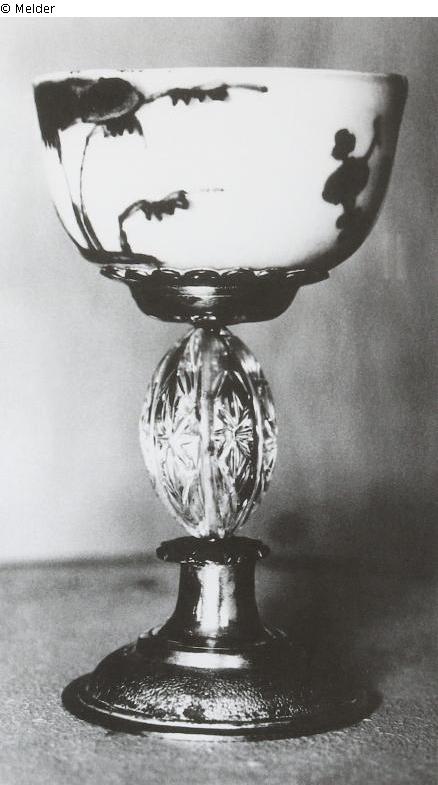 Pokal mit silbernem Fuß und geschliffenem Bergkristalls als Schaft, Kuppa aus einer blau-weiß bemalten chinesischen Schale gebildet.