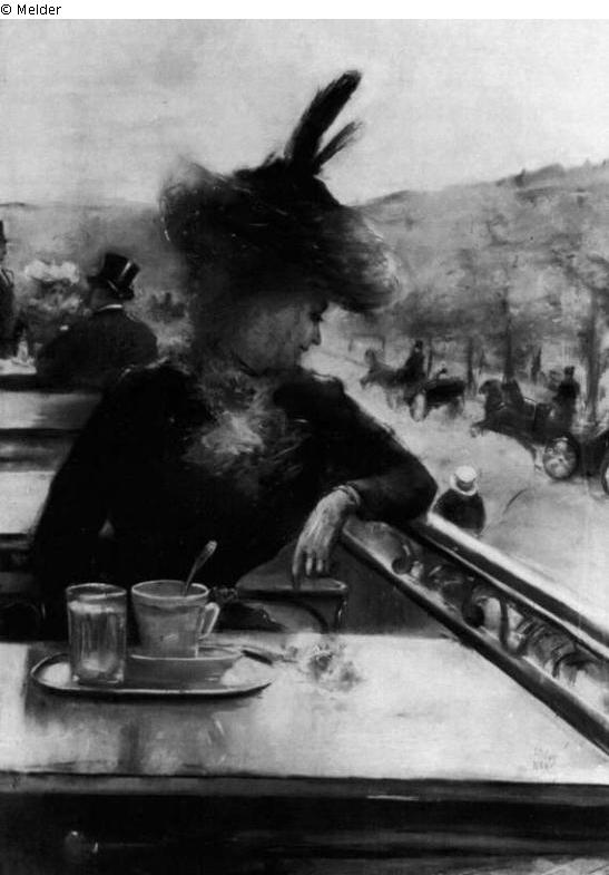 Pastellbild unter Glasscheibe. Eine junge Dame in dunklem Kleid mit heller Kragenschleife und unter Bedeckung eines ebenfalls dunklen Hutes, der rnit einem transparenten Schleier das Gesicht der Frau teilweise verdeckt und oben mit zwei Federn geschmückt ist, auf dem Balkon am Restauranttisch sitzend und sich nach rechts dem Geschehen unten auf der Straße zuwendend, den linken Arm dabei lässig auf das Geländer der Balkonbrüstung gelegt. Vor der Dame auf dem Tisch ein Tablett mit Kaffeetasse und Wasserglas, rechts daneben ein Strauß Rosen (?) auf die Tischplatte abgelegt. In der Tiefe der linken Hälfte des durch die markante Diagonale der von links oben nach rechts unten führenden Balkonbrüstung gegliederten Bildaufbaus, drei Tische weiter hinter ihr, drei andere Kaffeehausgäste: ein sitzendes Paar und ein stehender Herr daneben, die Herren mit Zylinder, die Frau mit aufwendig geschmücktem hellen Hut. Unten auf der Straße Unter den Linden jagen Pferdedroschken vor den Alleebäumen, welche eine parallele Diagonale bilden, entlang in die Tiefe der rechten Bildhälfte; vereinzelte Fuhrwerke und Personen auch in Gegenrichtung. Die Farbigkeit des malerischen Pastellauftrags ist unbekannt, da nur eine Schwarz-Weiß-Fotoaufnahme von diesem Bild existiert. Vermutlich ist nach Aussage der Kunsthistorikerin Sibylle Groß das Kolorit erheblich heller als auf dieser historischen Fotoaufnahme. Signatur und Datierung des Bildes auf der rechten unteren Tischplattenecke: L. Ury // 1888.
