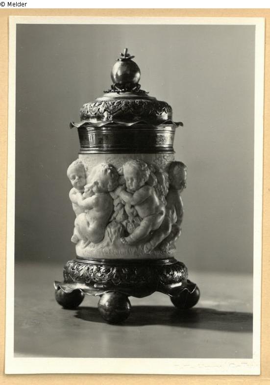 Kelch und Fuß aus vergoldetem Silber. Auf dem Deckel ein Granatapfel. An der Elfenbeinbekleidung des Kelches Hochrelief: Kinder mit Früchten (Bacchanalien).