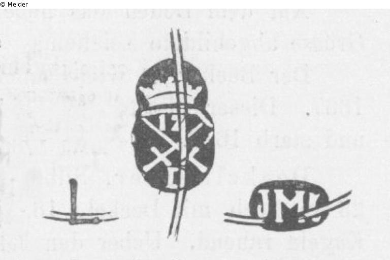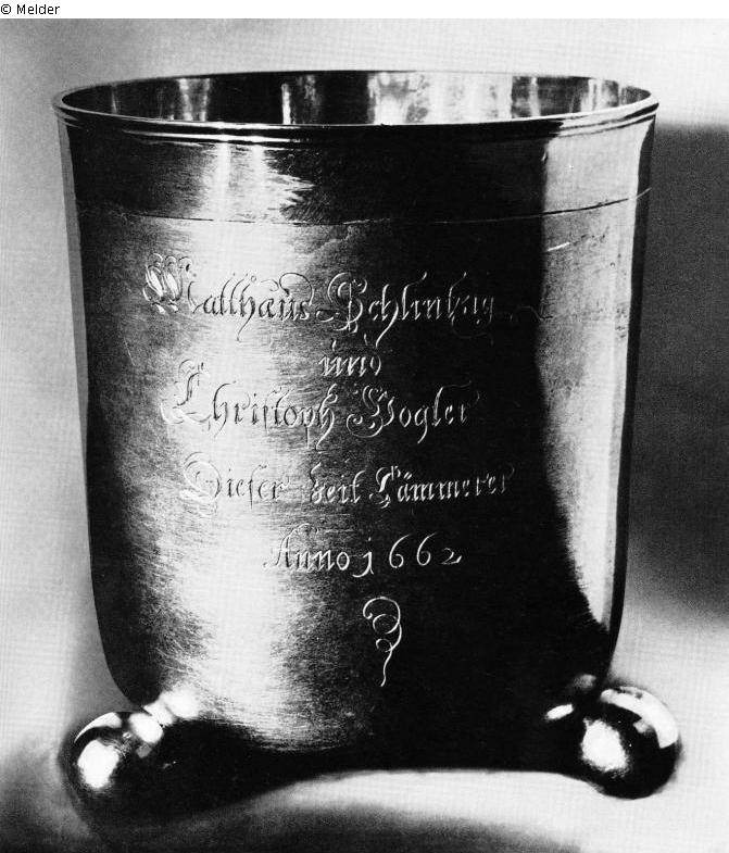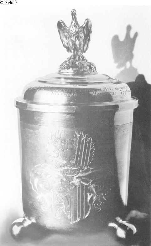 Auf dem Deckelknopfe ein Adler auf einem Fels. Graviert das Stadtwappen und die Inschrift: Matthaeus Schlintzig / und / Christoph Vogler / Dieser Zeit Cämmerer / Anno 1662 / In E. E. Raths Cammer gehörig. Auf dem Deckel: Ovo prognatus eodem Munusculum Patris et Avi utrorum rei Senatoriae instauratorum, postea Consulum, operculo desiderato redintegrat, Christoph: Henricus Voglerus tertium Consul Dresdae VI. Non. May M. DCCXII Scr. B. S. Gemarkt auf dem Rande des Deckels mit Leipziger Beschau und Meistermarke (A.). Der Deckel wohl von Johann Michael Winckelmann. Dieser und sicher auch das Wappen der Stadt Dresden aus dem Jahre 1712. Die zweite auf dem Boden angebrachte Markung mit Dresdner Beschau und Meistermarke (B.) gehört wohl dem ursprünglichen Meister von 1662, die erste einer Umarbeitung von 1712 an. Innen vergoldet.