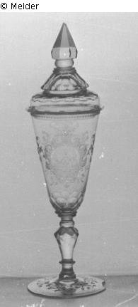 Geschliffen; am Kelche das grosse polnisch-sächsische Wappen und in einem Rahmen die Gestalt der Justitia mit Waage und Schwert. Im Deckelknopf ein rotgoldner Glasfaden. Am Fuße ein Stück abgebrochen. Anfang 18. Jahrh.