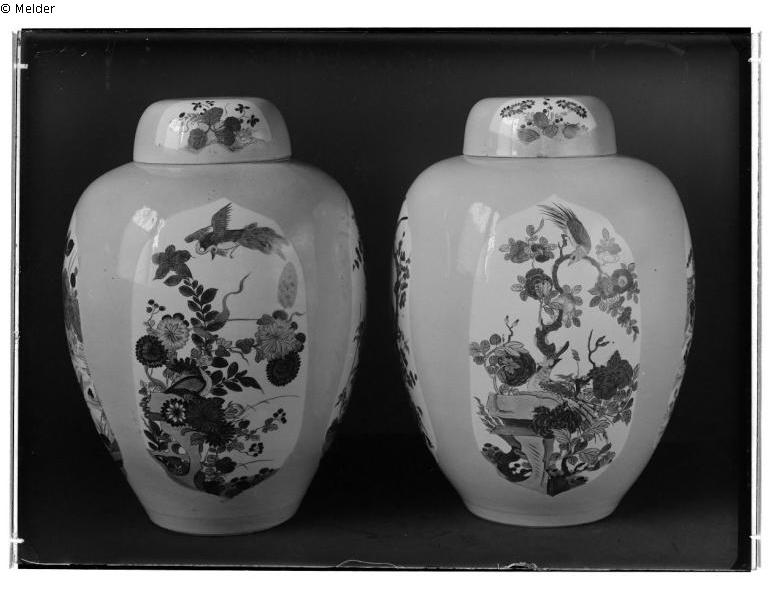 "121. Zwei urnenförmige Deckelvasen mit napfförmigen Deckeln, heller, kameliengrüner Grund mit ausgesparten Feldern, Schmelzfarbenmalerei im Stile der famille verte, Meißner Porz., Links: Unterglasurkobalt AR III 333, Höhe: (mit Deckel) 36,5 cm, Durchm.: ca. 25 cm. Rechts: Unterglasurkobalt AR III 332, Höhe mit Deckel: 36 cm, Durchm.: ca. 24,5 cm. (Turmzimmer, vormal. Residenzschloß Dresden)."