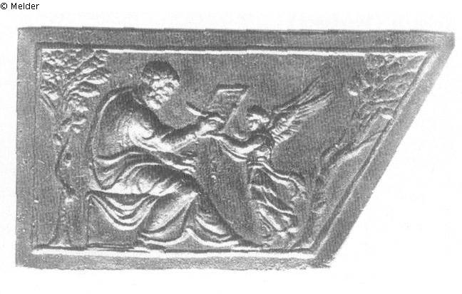 Unregelmäßig trapezförmige Plakette, ringsum schmaler Rahmen. Der bärtige Matthäus sitzt nach rechts gewendet auf einem Würfel. In der linken Hand hält er das Tintenfaß, und er schreibt mit der Feder in der rechten auf eine Tafel, die ihm der Engel entgegenhält. Rechts und links steht je ein Baum. Die Plakette ist der Abguß einer Kristalltafel von der Innenseite des Deckels der 1530-1532 entstandenen Kassette Papst Clemens' VII., des Hauptwerks Bellis, im Museo degli Argenti in Florenz.