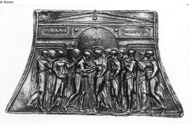 Trapezförmige Plakette. In der Mitte stehen Christus und ihm gegenüber Thomas, der seine Hand in die Seitenwunde Christi legt. Sie werden von den anderen Jüngern umringt, die die Szene beobachten und miteinander diskutieren. Im Hintergrund sieht man ein giebelbekröntes Rundbogenportal, von dessen Scheitel eine Lampe herabhängt. Auf zwei Tafeln erscheint die Signatur VALERIVS BELLVS FA. Die Plakette ist der Nachguß einer geschnittenen Kristalltafel Bellis. Eine rechteckige Variante befindet sich in der Skulpturensammlung der Berliner Museen.