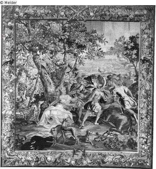 Gobelin - Bildteppich: Die Jagd des kalydonischen Ebers, unter einem links im Mittelgrunde stehenden, großen Baum, in dessen Ästen fliegende Amoretten bunte Blumengehänge befestigen, sitzt nach rechts gewendet die Jägerin Atalante, der von dem mit Helm, Schuppenpanzer und wehenden Mantel bekleidete Meleager der Kopf des erlegten Ebers überreicht wird, neben ihr ein barhäuptiger Krieger nach dem Schwerte greifend, rechts der blutenden Rumpf des Tiere, über den eine Jagdgefährtin mit dem Schwert in der rechten Hand heraneilt, vorne Jagdhunde und Waffen, im Hintergrunde weite Landschaft mit Bäumen und Bauwerke, umlaufende Bordüre mit Waffentrophäen, Eberkopf, Hunden, Hasen, Früchten und Blumen, auf der (beschädigten) Lisiere bezeichnet C. DE. WAEL, Farben: Schattiertes Blau, Grün, Braun, Gelb, Rot und Grau, sehr farbenfrisch, unterfüttert, flämisch.