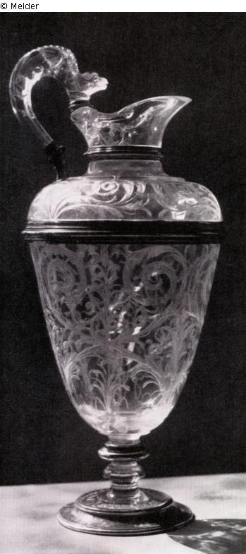 Hoher, kelchförmiger Pokal mit schlankem Fuß und geschliffenem Rankenwerk. Darauf eine flache Kanne als Deckel. Am Henkelansatz ein Streifen aus weißem Email. Vierfache silbervergoldete Fassung.