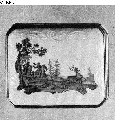 Katalog Hans W. Lange / Auktion 18.-19.11.1938, Kapitel "Dosen", S. 68: "535. Dose, rechteckig, grün bemalt mit schwarz gezeichneten Jagddarstellungen, die von unstaffierten Reliefrocaillen eingefaßt sind. Innen Watteauszene in Farben. Silbermontierung. Meißen, um 1745. H. 3,5 cm, Durchm. 7 : 8,6 cm. Tafel 37."