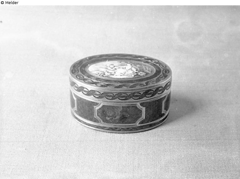 Oval, Klappdeckel. Flächen graviert, teilweise guillochiert. Ornament teilweise ausgefüllt mit durchsichtig grünem Schmelz. Auf Deckel ovales Emailbildchen: Schäferpaar, im Grisaille vor hellem Wolkenhimmel. Innen glatt Gold, Gewicht: 61 g, Marke: Innen auf Deckel und Boden: Jb. B gekrönt, Paris, 1765 - 1766, R.6424, Pz. R.6519, J.J. Prevost, 1762 - 1768, Mrz. CLB, Charles Le Bastier, Mr. 1754 - 1782, R.6698, "1331", auf Stulp Hundestempel R.6516, zweimal Adlerkopf R.6595