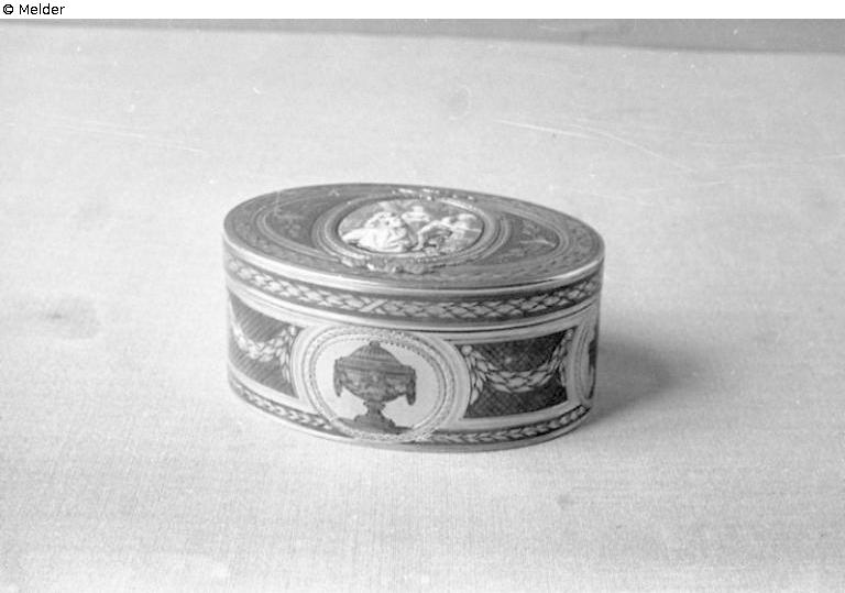Oval, Klappdeckel. Aus Gold, Wände, Boden, Deckel graviert und guillochiert (Lorbeerkränze, Vasen) teils mit grün durchsichtigem Schmelz überdeckt. In Mitte des Deckels ovales Grisaille-Emailbildchen: Junger Mann mit zwei Damen unter Baum, auf rotem Grund. In plastischem Rahmen aus Gold. Innen glatt Gold. Marke: Innen auf Boden und Deckel: Jb. C gekrönt, Paris, 1766 -1767, nicht bei R., Pz. R.6519, J.J. Prevost, 1762 - 1768, Mrz. CLB, Charles Le Bastier, Mr. 1751 - 1782 (R.6698), daneben 1417, auf Stulp Hundekopfz. R.6516 (?)
