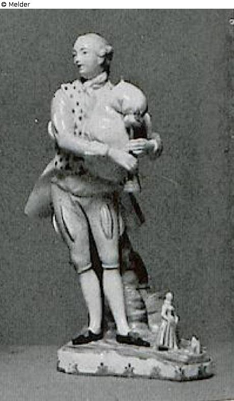 Dudelsackpfeifer mit Marionette. Stehend hält er den Dudelsack in seinen Armen. Mit dem linken Fuß tritt er auf ein Brett, auf dem er durch die Bewegung des Fußes eine Puppe tanzen läßt. Uber der hellpurpurnen Jacke trägt er eine Pelzweste, die hellbraunen Kniehosen sind geschlitzt. Sockelboden und -stütze bunt staffiert. Um den Sockel eine Goldbordüre. Leicht bestoßen. Unterglasurblauer Bindenschild. Eingeritzt R. Wien