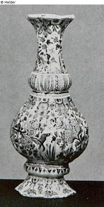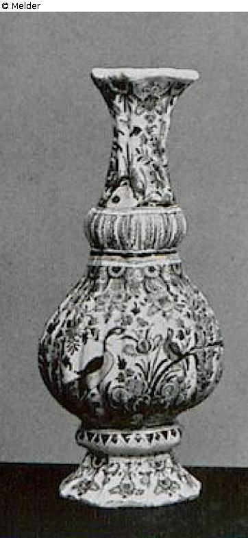kannelierte Balusterform. In Blau, Rot, Gelb und Grün bemalt mit Pfauen und anderen Vögeln auf Blumenstauden sowie Blattfriesen und Lambrequinbordüren. Ausgebessert. Berlin, Anfang 18. Jahrh., Fabrik Wolbeer. (O. v. Falke, Alt-Berliner Fayencen, 1923, Abb. 13c.) H. je 34 cm. Literatur: Auktionskatalog Hans W. Lange, Wertvolles Kunstgewerbe, Berlin, 19.-21. Mai 1941, S. 79. Nr. 358, Taf. 45 (DOI: Externer Link)