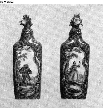 Katalog Hans W. Lange / Auktion 18.-19.11.1938, Kapitel "Dosen", S. 67: "530. Ein Paar Flakons, flache kantige Flaschenform. Hellgrüner Fond, überzogen von violettem Netzwerk, darin weiße, von farbigen Rocaillen eingefaßte Reserven mit Harlekin und Kolombine vor Landschaften. Goldmontierung. Als Stöpsel Blütensträuße. Originaletui aus grüner Fischhaut. Meißen, Mitte 18. Jahrh. H. 7 cm. Tafel 38."