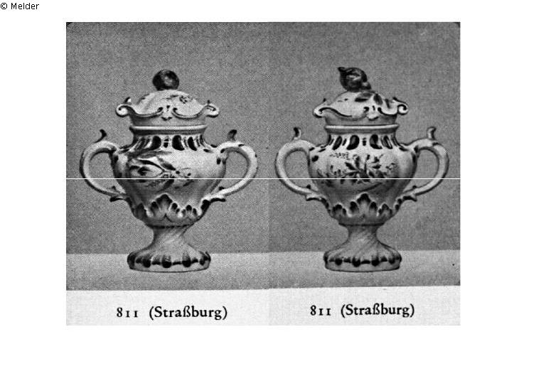 bauchige Form mit Fuß und zwei Henkeln. Purpurn staffierte Reliefrocaillen. Die Wandung mit Blumensträußen aus Nelke, Rose, Glockenblume usw. bemalt. Auf dem Deckel eine Rosenknospe als Knauf. Ein Deckelknauf gekittet. Bezeichnet: J. H. (Joseph Hannong).