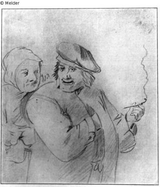 Ein rauchender Bauer, hinter ihm seine Frau