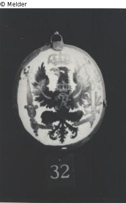 Der weiße Grund zeigt den heraldischen preußischen Adler, in der Rechten das Zepter, in der linken das mit Lorbeer umwickelte Schwert. Auf der Brust befinden sich die Initialen "F.R.". Adlerkrallen in Gold gemalt.