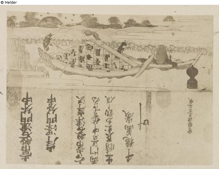 Surimono ist in der Mitte geteilt; oben und unten Text; auf engem Flüsschen, dessen Ufer befestigt sind, wird ein mit Saketonnen beladenes Boot vorwärts gestoßen; auf den Fässchen die bekanntesten Schauspielerwappen von Yeddo aufgemalt; der riesige Sonnenball ist im Versinken, Vögel fliegen über die Felder; das Ganze in seinem ungewöhnlichen Format vielleicht die Dankeskarte von Schauspielern für die ihnen zu Neujahr übersandten Aufmerksamkeiten.