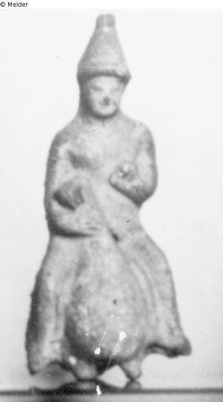 Reiter mit spitzer Mütze auf Ente, in der Linken einen Ball. Weißer Überzug, Reste hellroter Farbe