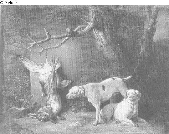 Vor einem Steinpostament im Walde ist Jagdbeute an einem Strick über einen Ast gehängt: an dem einen Ende ein Vogel, am anderen ein Hase, dessen vorderer Körper auf dem Boden liegt; rechts ein stehender und ein liegender Hund; Signatur: J B. Oudry 1750; Maße: 73,8 x 92,2 cm