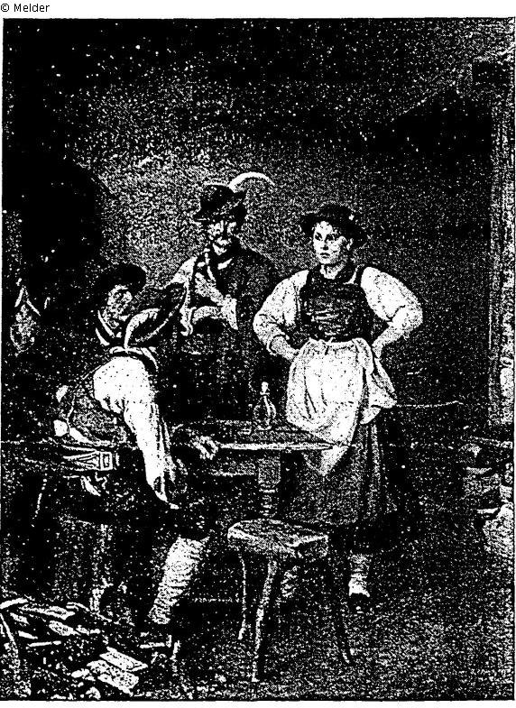 Drei Senner, von denen zwei am Tisch sitzen und der dritte beobachtend Pfeife raucht, in Unterredung