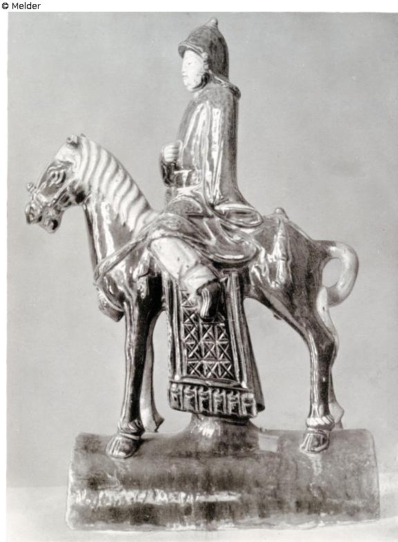 Sammlung Eduard Fuchs, erworben zwischen 1912–1922 und in dessen Besitz bis 1933; 25.10.1933 Beschlagnahmung durch die Gestapo; zwangsweiser Verkauf (Zahlung Reichsfluchtsteuer) 1937 durch seine Tochter Gertraud Fuchs: Versteigerung Auktionshaus Rudolph Lepke Berlin, Katalog 2115, S. 6 - am 15.10 und am 16.10.1937 wurde dieser Dachreiter unter Nr. 24 versteigert: „FAYENCE-DACHREITER: Mann mit Helmkappe zu Pferde; grün, gelb und schwarz glasiert. Höhe 33 cm. Ming“.