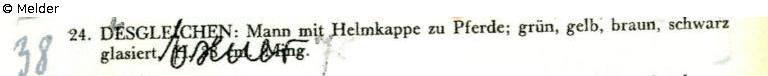 Fuchs-Text zu Tafel 37: „Dachreiter. Reiter auf ruhigstehendem Pferd. Polychrom glasiert: Pferd schwarz mit gelber Mähne, Helm und Mantel des Reiters sowie der Rundziegel grün. Höhe 38 cm.“